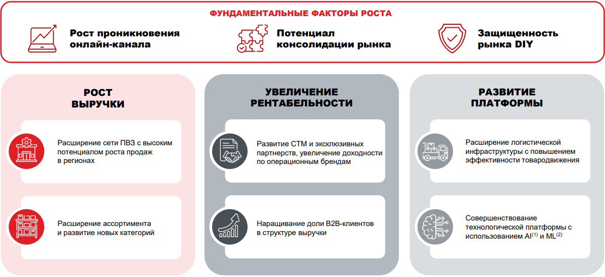 - Рост выручки за счет расширения сети ПВЗ с высоким потенциалом роста продаж в регионах и увеличения ассортимента, включая развитие новых категорий.
