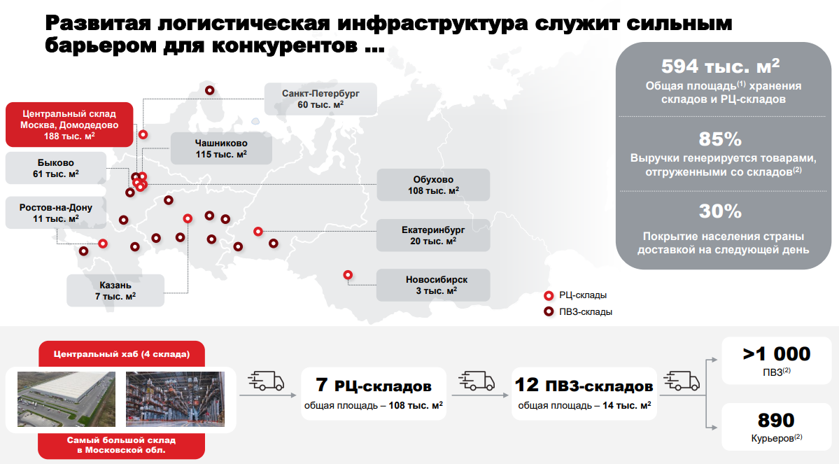 - Компания планирует развиваться в регионах, однако уровень проникновения онлайн-торговли там существенно ниже, чем в Центральном регионе, что может затормозить рост продаж.