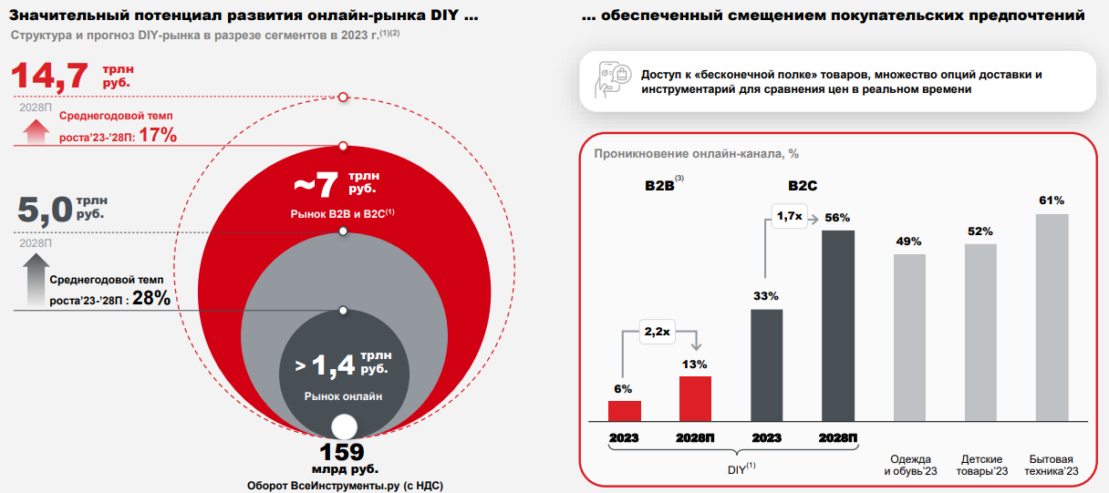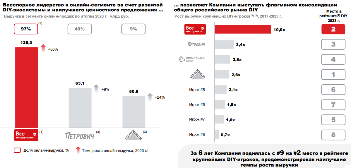 Компания «ВсеИнструменты.ру» является лидером российского онлайн-рынка DIY по объему онлайн-выручки, а также ведущим игроком по глубине ассортимента и географическому покрытию среди DIY-игроков (DIY — сокращение лозунга «Do it Yourself», который можно перевести как «сделай сам»).