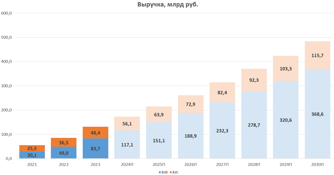 По итогам 2023 г. активы группы составили 49.7 млрд руб. (+51%). Выручка по итогам 2023 г. составила 132.8 млрд руб. (+54%). Ожидаем, что по итогам 2024 г. выручка достигнет значения 174.1 млрд руб. (+31%), а ее дальнейший рост продолжится снижающимися темпами на уровне в среднем 16% ежегодно до 2030 г. Наш прогноз роста бизнеса значительно ниже организаторов размещения.