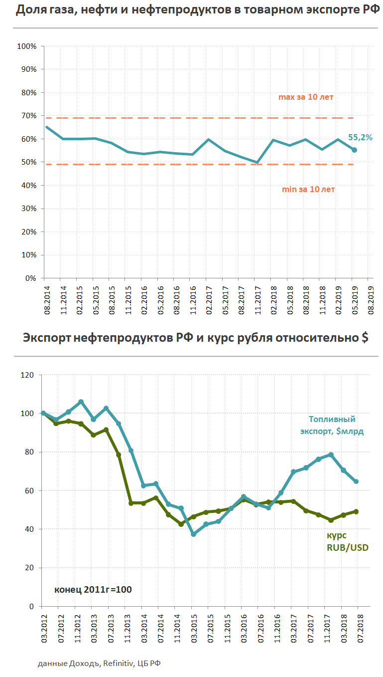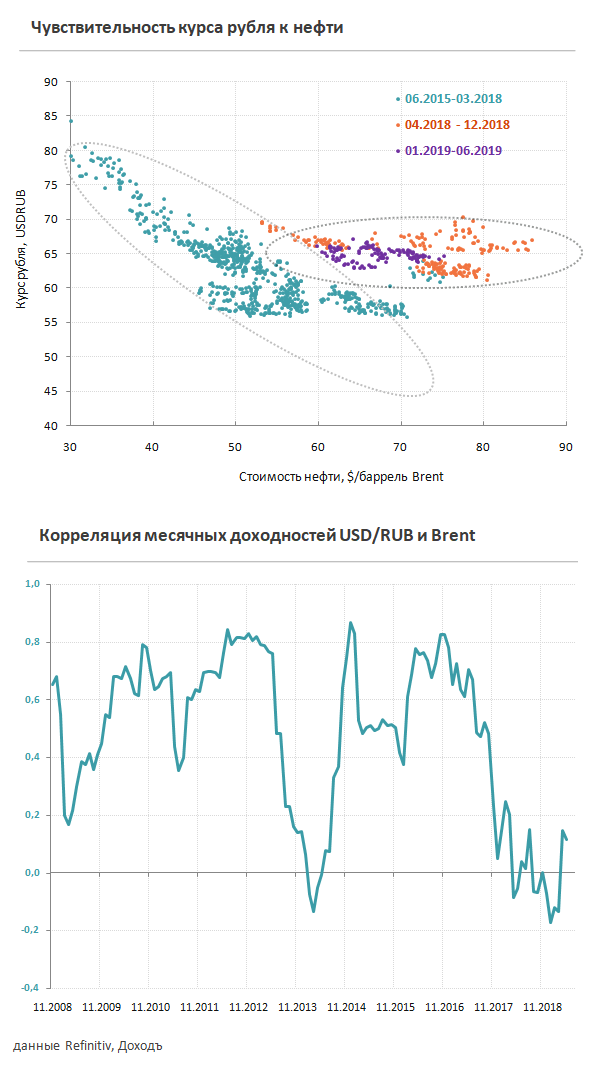По итогам первого полугодия 2019 года рубль вырос на 10,3% до 63 рублей за доллар, заметно отстав от роста цен на нефть. Зависимость российской валюты от топливного рынка остается низкой из-за политики Минфина, который в 2019 году на дополнительные доходы от цен на нефть выше базового уровня в $42,4 покупает валюту, которая затем будет отправлена в фонд национального благосостояния (ФНБ). Формирование резервов сдерживает укрепление рубля при росте цен на нефть и способствует снижению его волатильности.
