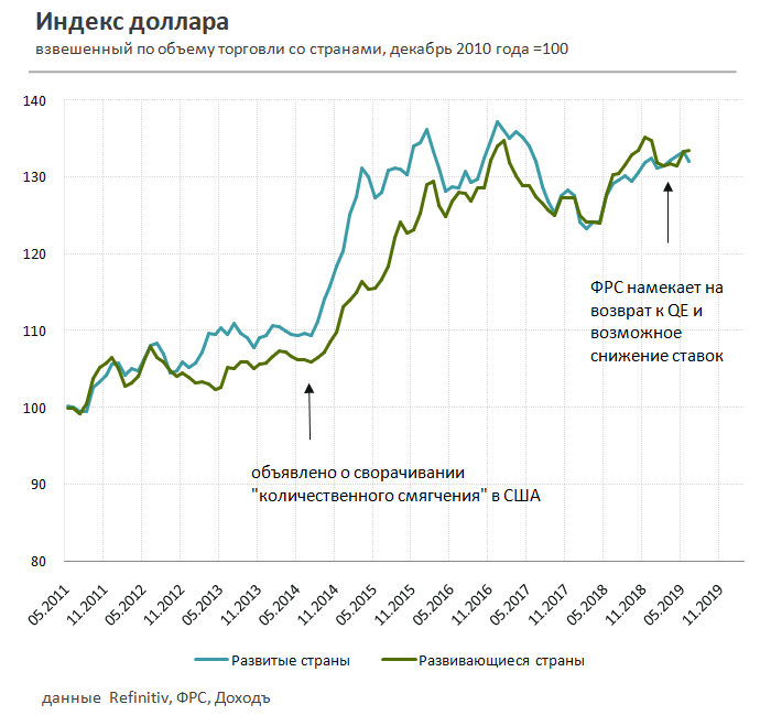 Сворачивание программы количественного смягчения и увеличение процентных ставок ФРС США с 2014 года привели к росту стоимости доллара не только относительно рубля, но и ко всем ведущим мировым валютам.