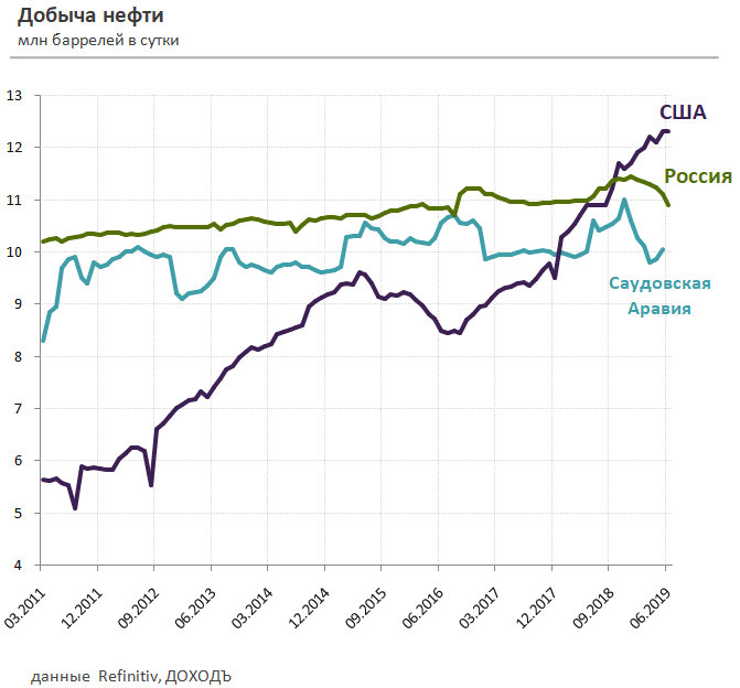 Усилия ОПЕК по сокращению нефтедобычи компенсируются ее ростом в Северной Америке. С начала 2018 года добыча нефти в США выросла на 25% до 12,4 млн барр/cутки в мае 2019 года. Министерство энергетики США ожидает роста показателя до нового исторического максимума в 13,3 млн баррелей в 2020 году. В ближайшие 6 лет добыча в США обеспечит практически 60% роста мировой добычи.