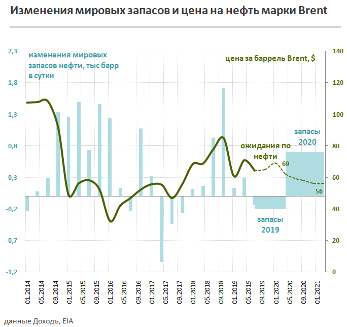 Мы ожидаем небольшой дефицит на мировом рынке нефти во второй половине 2019 года, который скажется на сокращении мировых запасов средним темпом в 200 тысяч баррелей в сутки. Такой темп снижения приведет к росту цен на нефть на 8% к концу 2019 года с $64 до $69 за баррель марки Brent.