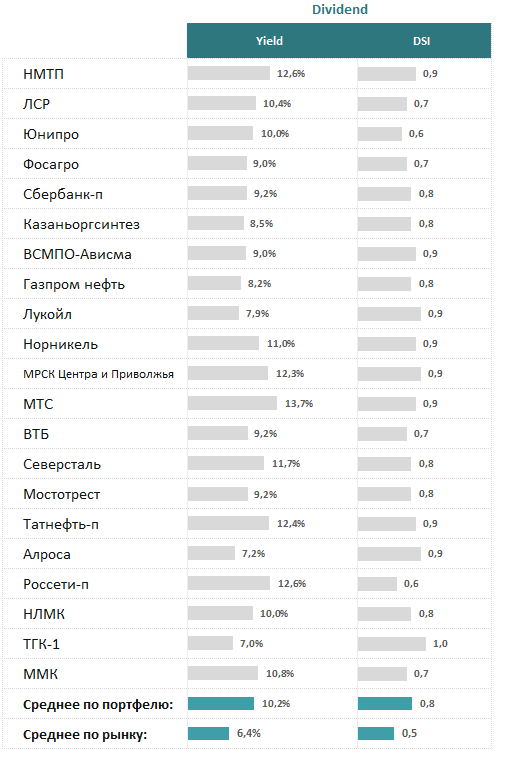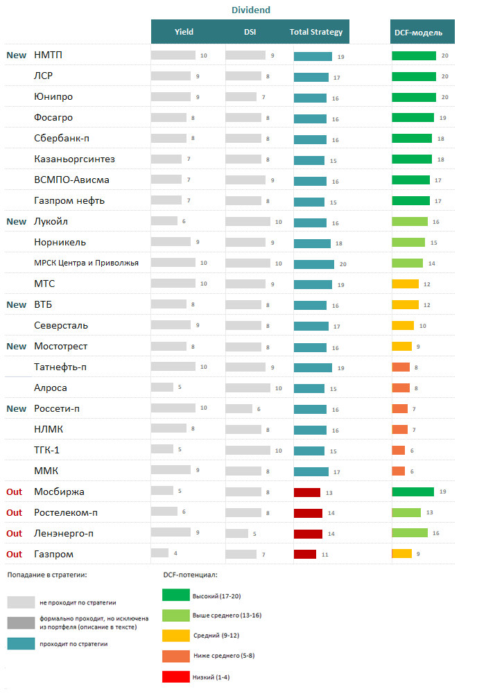 Портфель формируется из 15-20 компаний с высокими и стабильными дивидендами. Рейтинг по стратегии представляет собой сумму баллов по двум индикаторам: ожидаемая дивидендная доходность и индекс стабильности дивидендных выплат «DSI». По каждому из индикаторов рейтинг составляет от 1 до 10. Чтобы попасть в портфель сумма баллов должна быть не меньше 15. Посмотреть текущие рейтинги компаний можно в сервисе «Анализ акций» на нашем сайте.
