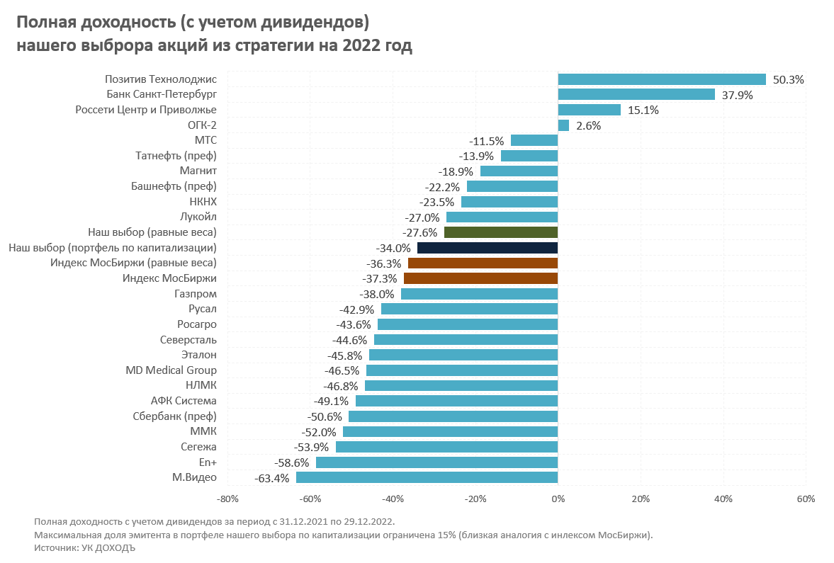 При формировании мнений по акциям на 2023 год мы сосредотачиваемся, прежде всего, на качестве бизнеса компаний, их возможностях приспосабливаться к быстро меняющимся обстоятельствам, сильной основе потенциального роста их стоимости (прежде всего, дивидендам). Если такие компании дешевы вследствие санкций и рисков, - отлично, если не очень, то хороший бизнес по справедливой цене также будет отличной инвестицией.