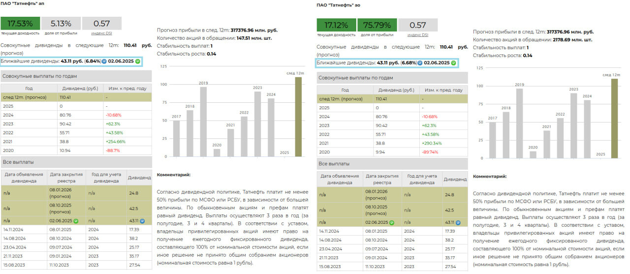 Совет директоров Татнефти рекомендовал финальные дивиденды за 4 квартал 2024 года в размере 43,11 руб. на обыкновенную и привилегированную акции. Дата закрытия реестра — 2 июня 2025 г.