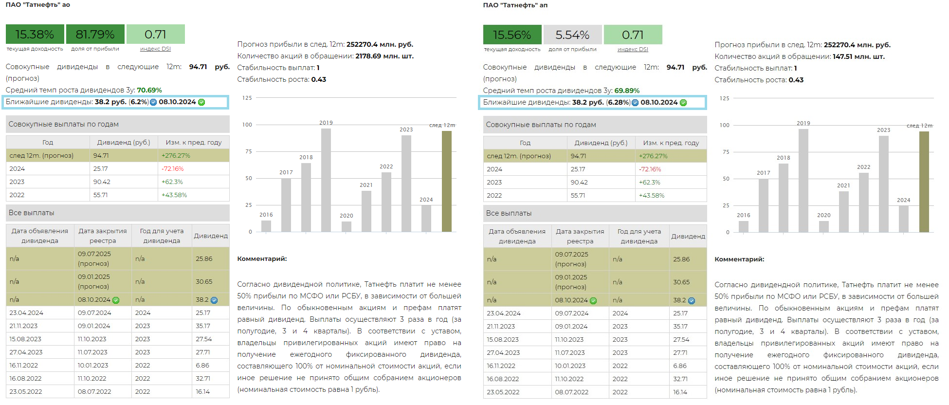 Совет директоров Татнефти рекомендовал дивиденды за первую половину 2024 года в размере 38,2 руб. на обыкновенную и привилегированную акцию. Дата закрытия реестра – 8 октября 2024 г.