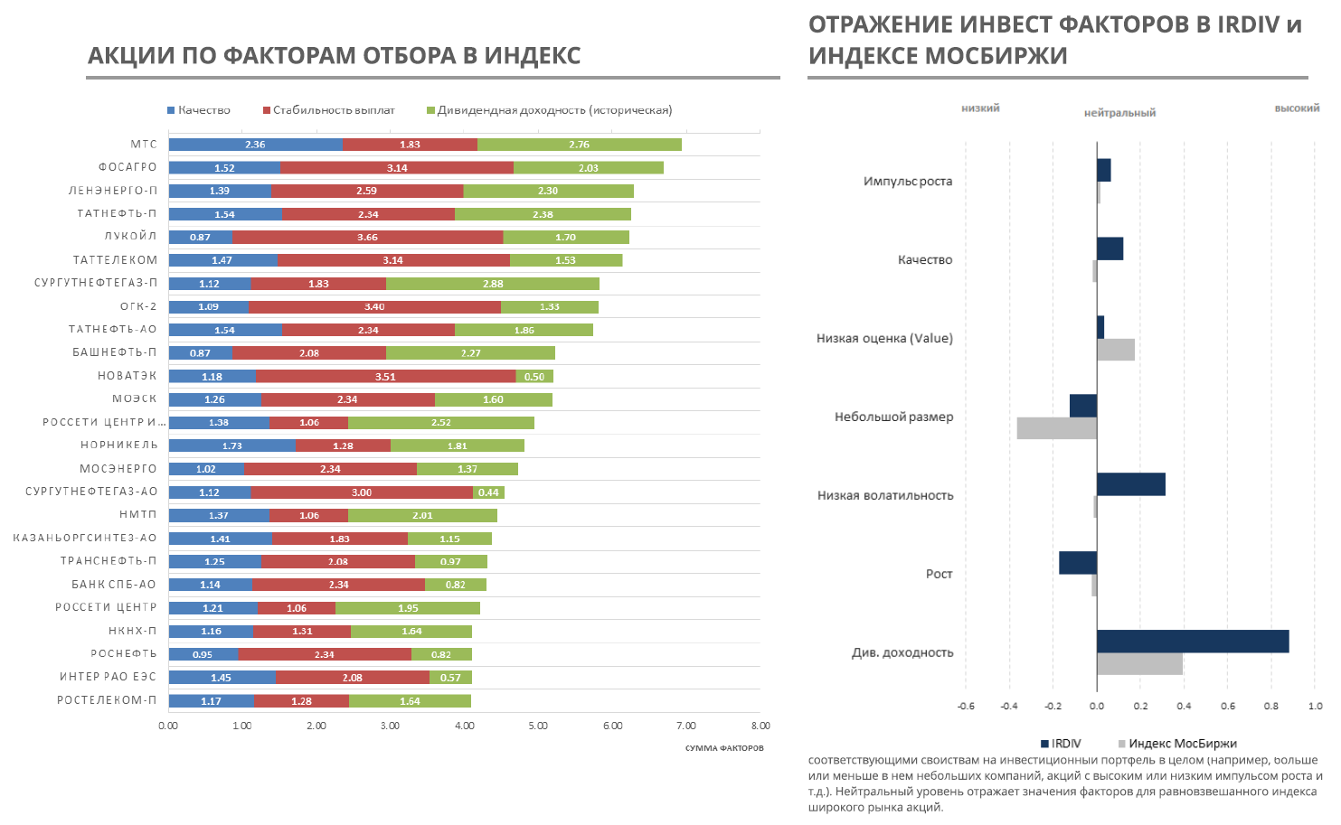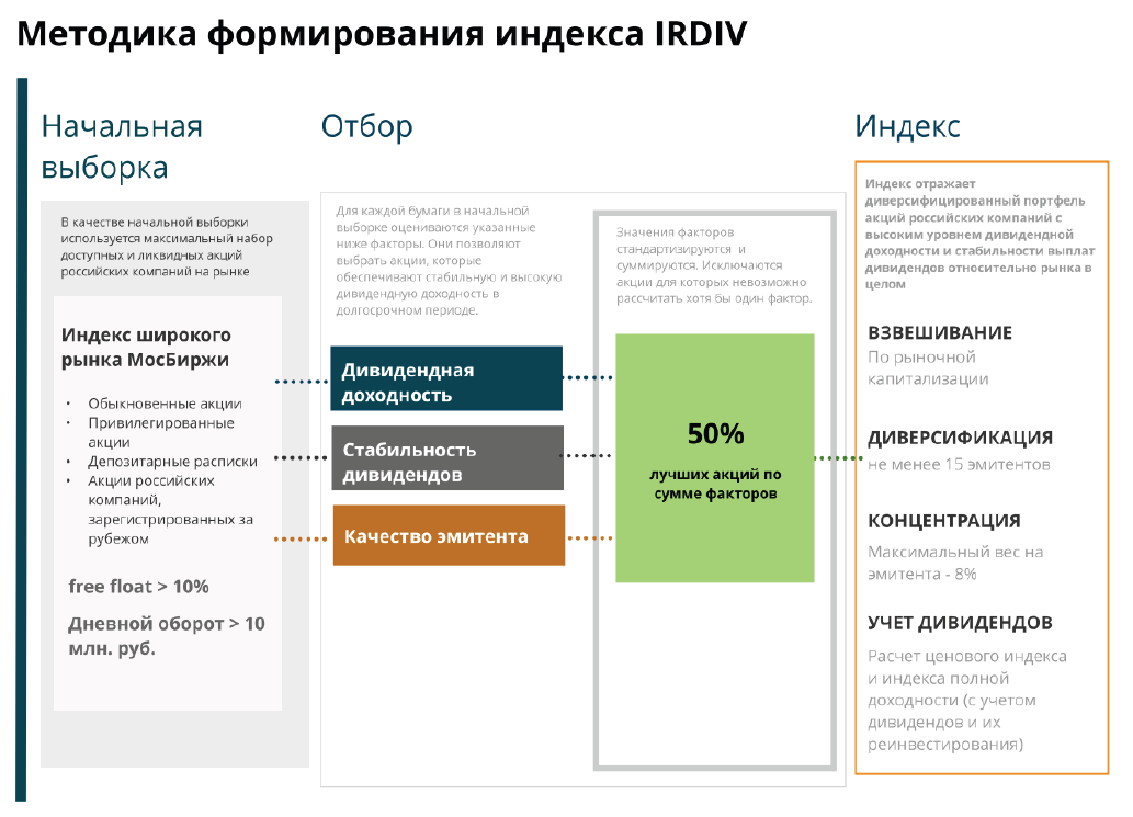 Как правило, в индекс попадают бумаги, у которых по крайней мере два фактора лучше рынка, один из этих факторов — всегда дивидендный (стабильность или доходность).