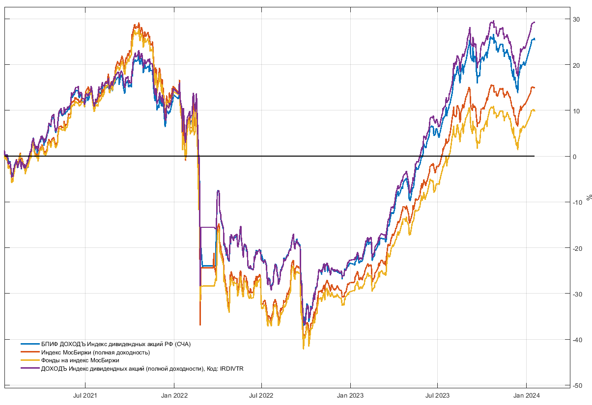 Динамика доходности DIVD ETF, индекса IRDIVTR, индекса МосБиржи и фондов акций на индекс МосБиржи