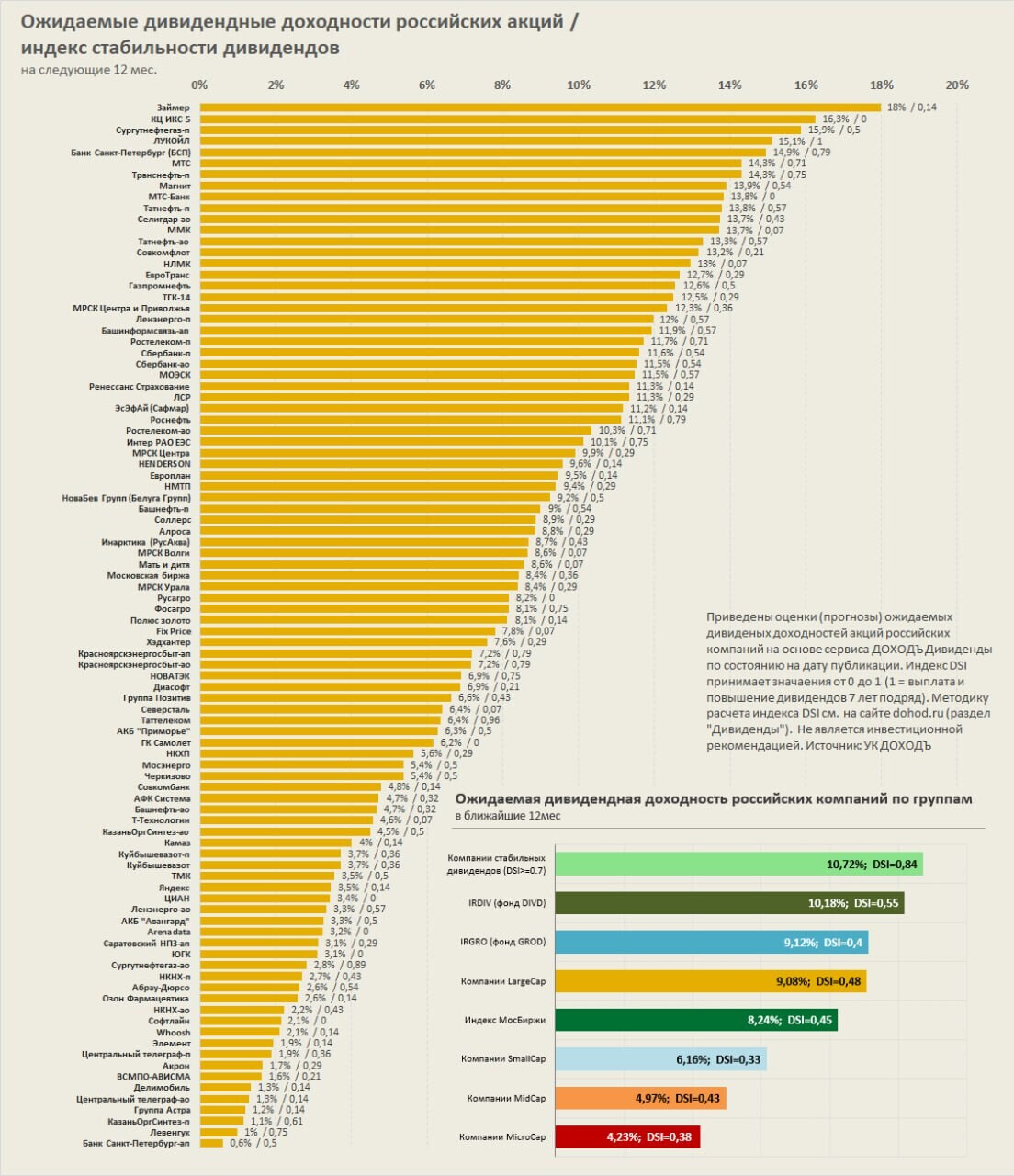 Ожидаемые дивидендные доходности и индекс стабильности дивидендов (DSI) акций российских компаний на следующие 12 месяцев на основе нашего сервиса «ДОХОДЪ Дивиденды».