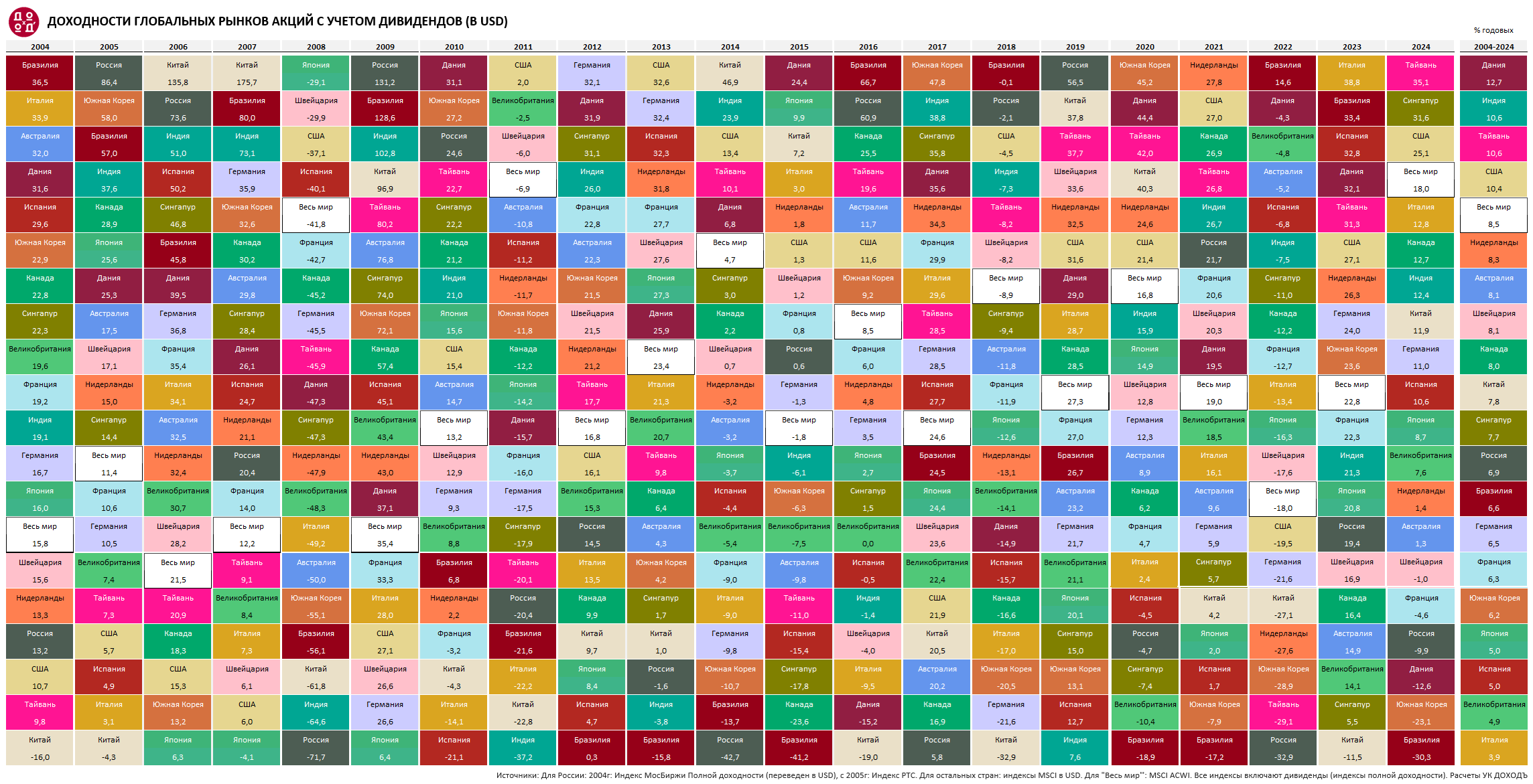 Ежегодные доходности рынков акций различных стран (включая дивиденды), 2004-2024 гг. Сортировка по убыванию доходности внутри каждого года. Источник: LSEG, MSCI. Расчеты УК ДОХОДЪ