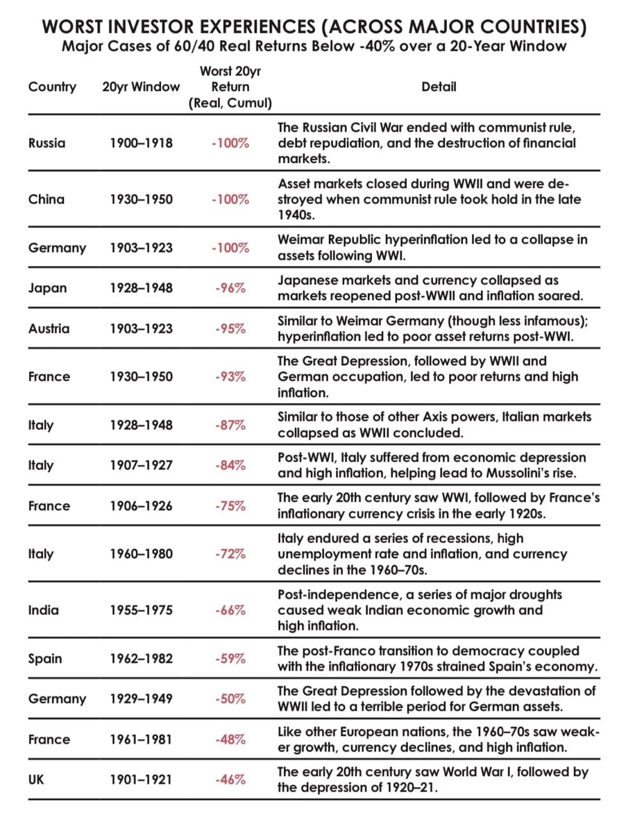 На следующей картинке из книги Рэя Далио «Principles for Dealing with the Changing World Order» представлены случаи падения стоимости инвестиционных портфелей 60/40 (60% акций + 40% облигаций) более чем на 40% (или их полный коллапс) в отдельных странах за 20-летний период.