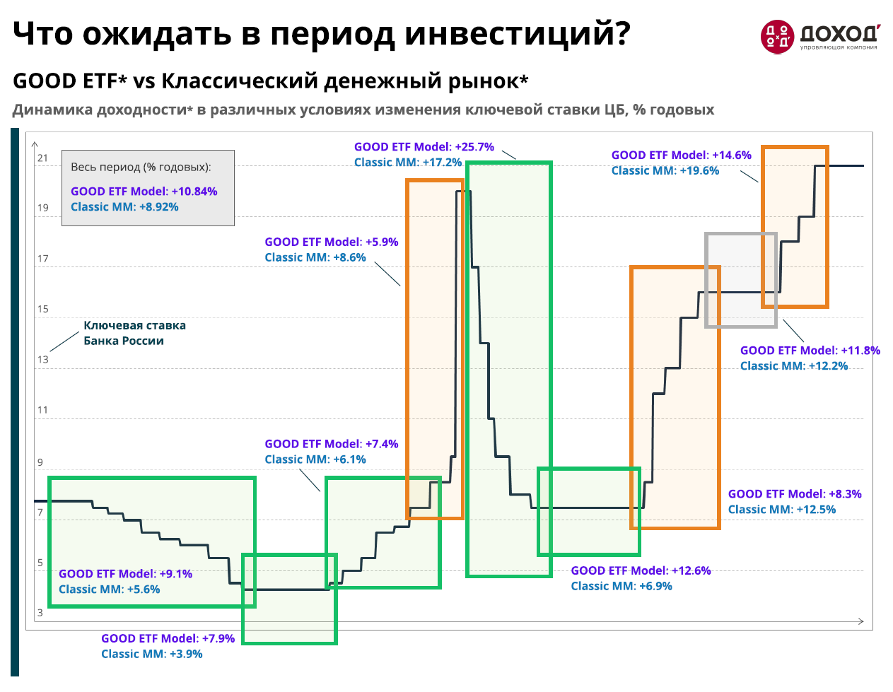 Динамика доходности модели фонда GOOD ETF (GOOD ETF Model) и классических инструментов денежного рынка (Classic MM) в различных условиях изменения ключевой ставки Банка России. Все данные представлены в % годовых. Доходность показателя GOOD ETF Model рассчитана исходя из модели поведения инвестиционного портфеля, сформированного на основании методики отбора облигаций в фонд GOOD ETF за период с 01.07.2019 по 09.12.2024 гг. Доходность показателя Classic MM (инструменты классического денежного рынка) рассчитана исходя из: до 16.01.2020 — индекс полной доходности, рассчитаный из ставок РЕПО на МосБирже, начиная с 16.01.2020 — индекс полной доходности, рассчитанный на основе цен LQDT ETF на Московской Бирже. Данная информация представлена исключительно в информационных целях и может не отражать реальных результатов инвестиций. Результаты инвестирования в прошлом не определяют доходы в будущем. Источник: рачсеты УК ДОХОДЪ, данные — МосБиржа, ЦБ РФ.