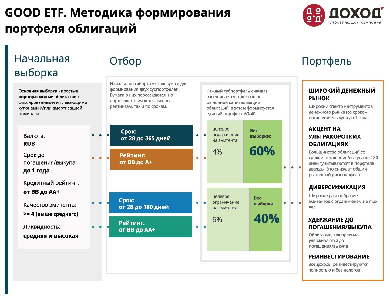 Помимо этого, GOOD ETF рассчитан на получение повышенной доходности за счет инвестиций в короткие облигации. Такой подход, кончено, сопряжен с некоторыми рисками.