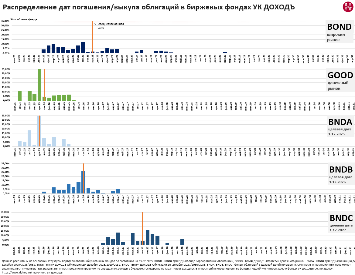 На графике распределения дат погашения облигаций в фондах УК «ДОХОДЪ» он всегда будет находиться на сроке около 6 месяцев как «вечный» короткий фонд. GOOD ETF не имеет «даты окончания». Он как конвейер: работает без остановки.