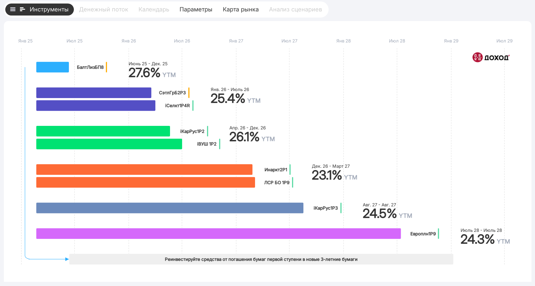Визуализация лестницы облигаций в платформе для построения стратегии лестницы ДОХОДЪ «Лестница облигаций»: https://analytics.dohod.ru/ladder