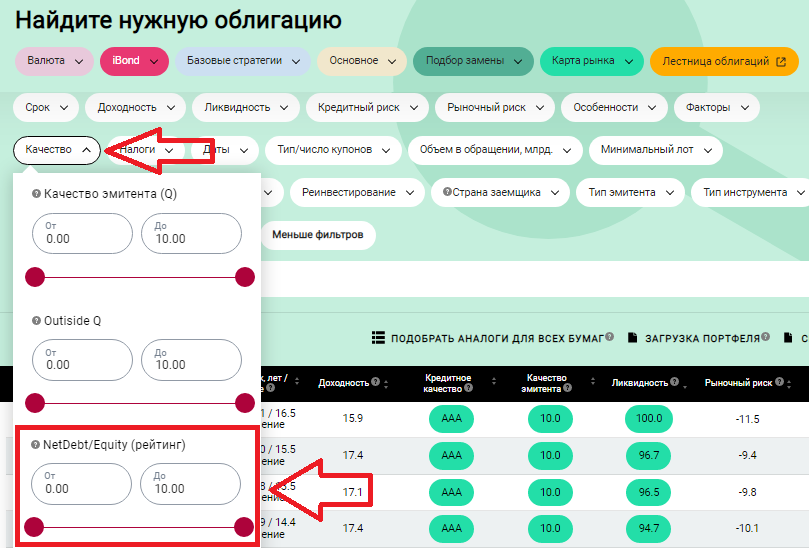 Фильтр NetDebt to Equity (отношение чистого долга к собственному капиталу) в сервисе ДОХОДЪ «Анализ облигаций»