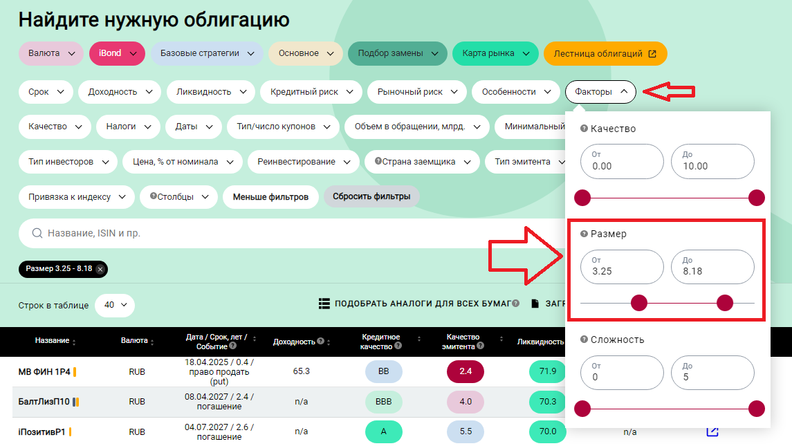 Вы можете самостоятельно регулировать размер компаний и NetDebt to Equity в отборе облигаций с помощью нашего сервиса «Анализ облигаций».