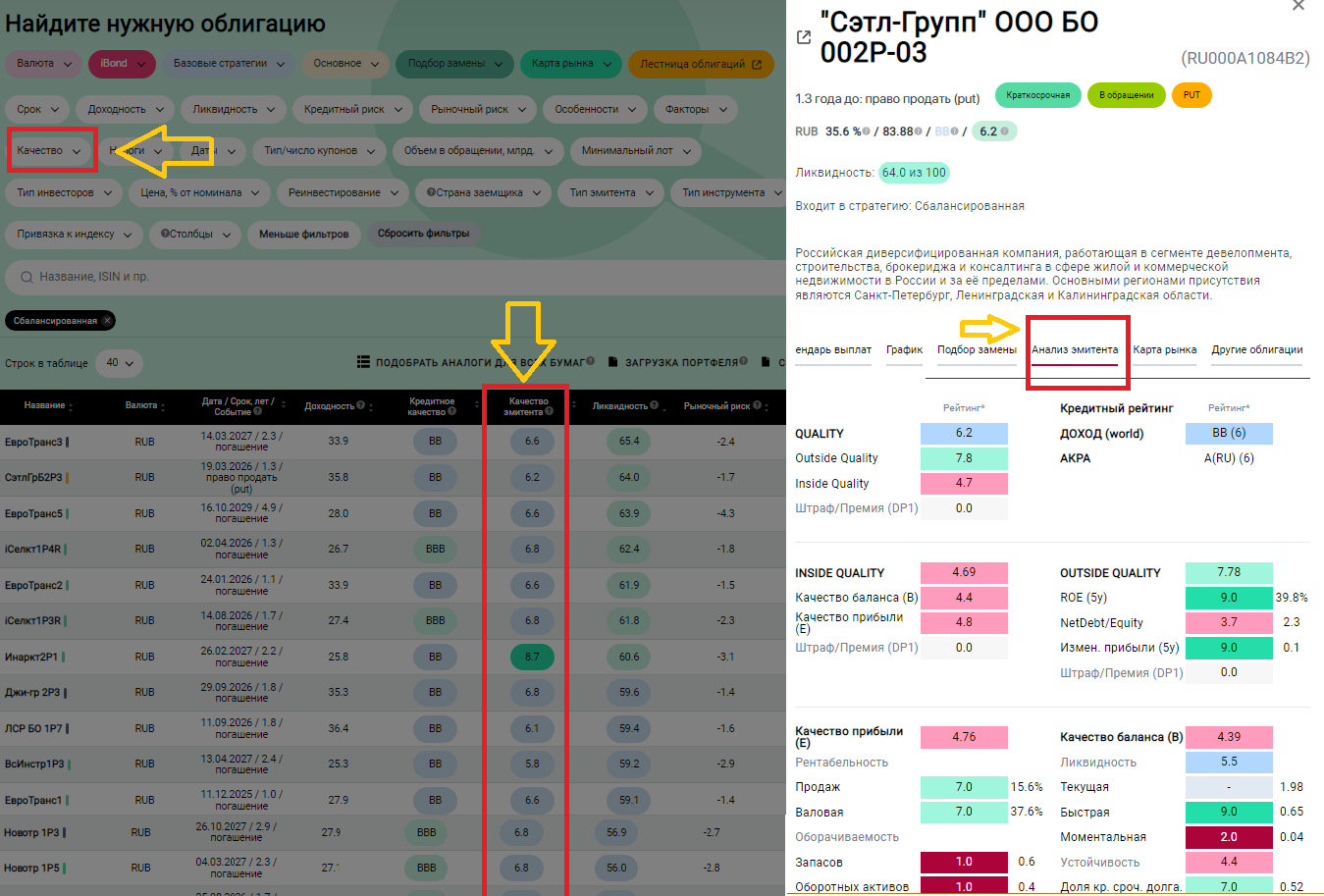 Отбор облигаций по критерию «Качество эмитента» и еще десяткам параметров вы можете делать с помощью нашего сервиса «Анализ облигаций».