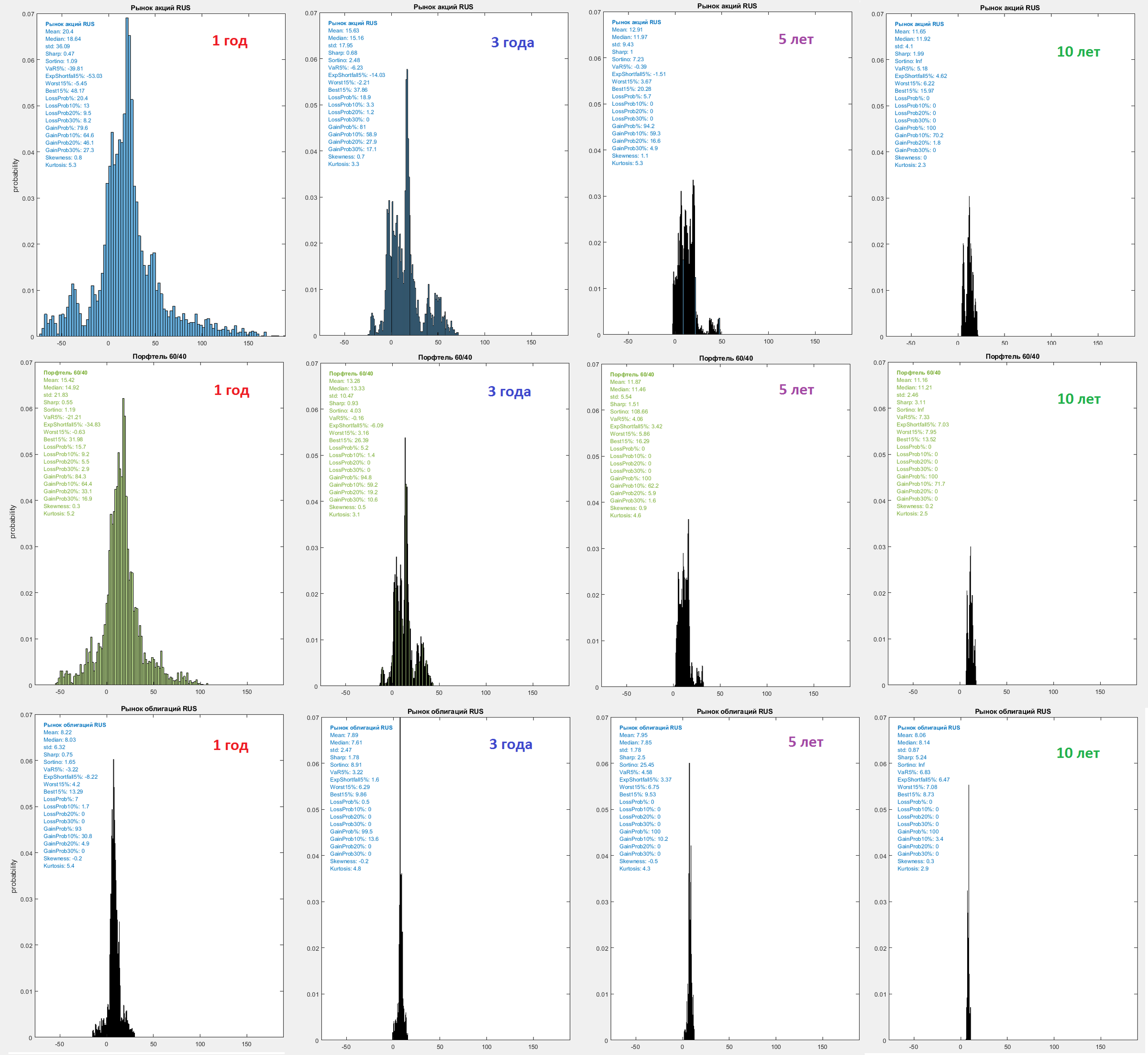 Все это делается для каждого инвестиционного горизонта. Эти данные используются, чтобы сформировать оптимальные портфели (доли разных активов) для профиля риска, подходящего под конкретную инвестиционную цель и самого инвестора.