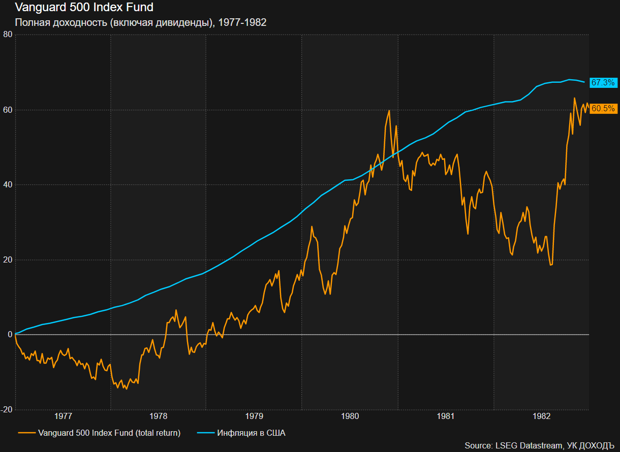 Полная доходность (включая дивидегды) фонда Vanguard 500 Index Fund и инфялция в США, Январь 1977 - Июль 1982. Источник : LSEG