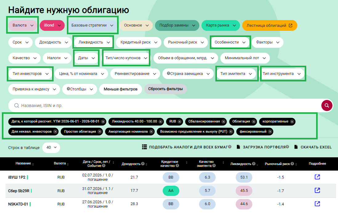 Выберите нужную валюту, дату погашения/выкупа вокруг каждой целевой даты каждой ступени (например, +- 30 дней, расширяйте, если необходимо), а затем нужные вам типы облигаций и параметры кредитного качества (например, допустимые кредитные рейтинги или готовую базовую стратегию), ликвидность (не менее 30 из 100) и прочие параметры (пример на скрине ниже).