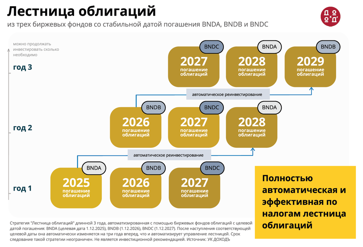 Трехлетняя лестница облигаций из биржевых фондов УК ДОХОДЪ: BNDA. BNDB и BNDC ETF. Не является инвестиционной рекомендацией. Источник: УК ДОХОДЪ