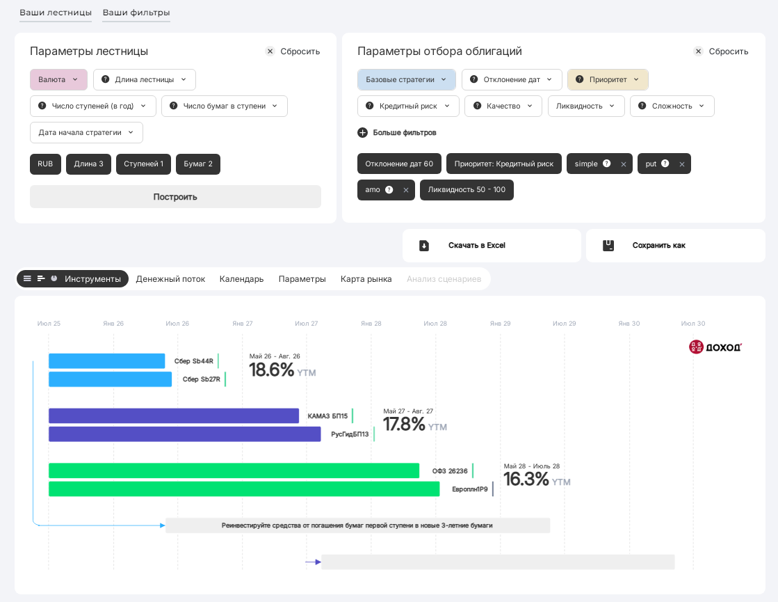 С помощью нашего сервиса «Лестница облигаций» вы можете создавать готовые лестницы с большим набором индивидуальных параметров (от числа ступеней и бумаг в ступени до приоритета отбора, отклонения дат от целевой, кредитных рейтингов, качества и ликвидности), а также редактировать набор облигаций для каждой ступени. Это онлайн-конструктор лестниц.