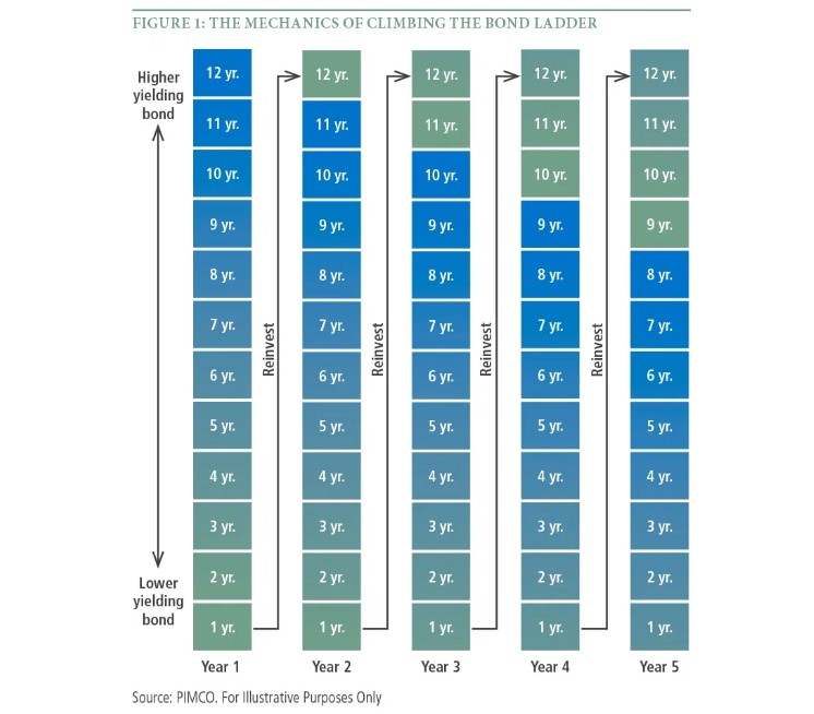 Лестница предполагает покупку набора облигаций со сроком погашения/выкупа в разное время — от коротких до длинных. Средства от погашения ближайших коротких бумаг реинвестируются в длинные на срок лестницы. Купоны формируют текущий доход или реинвестируются.