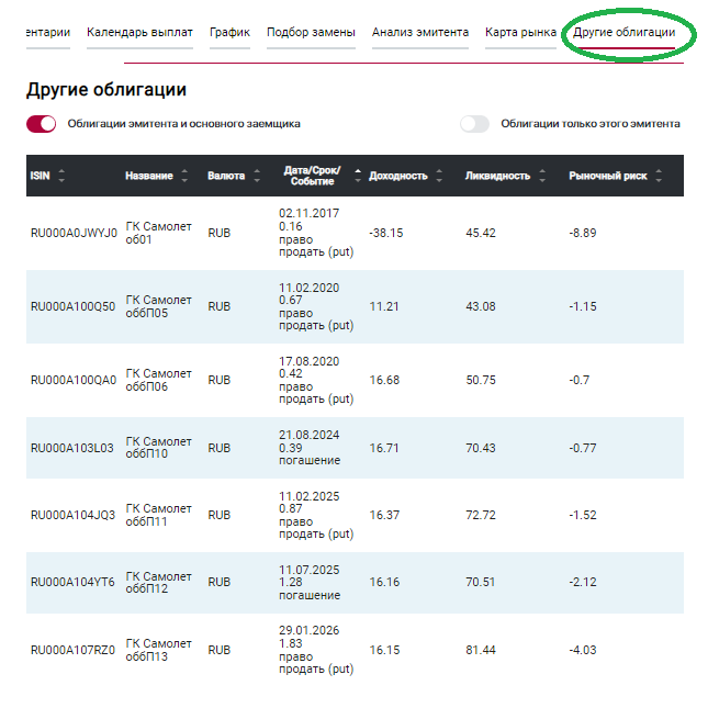 Это новый раздел. Здесь отображаются все бумаги эмитента или все бумаги эмитента и основного заемщика. Поля кликабельны.