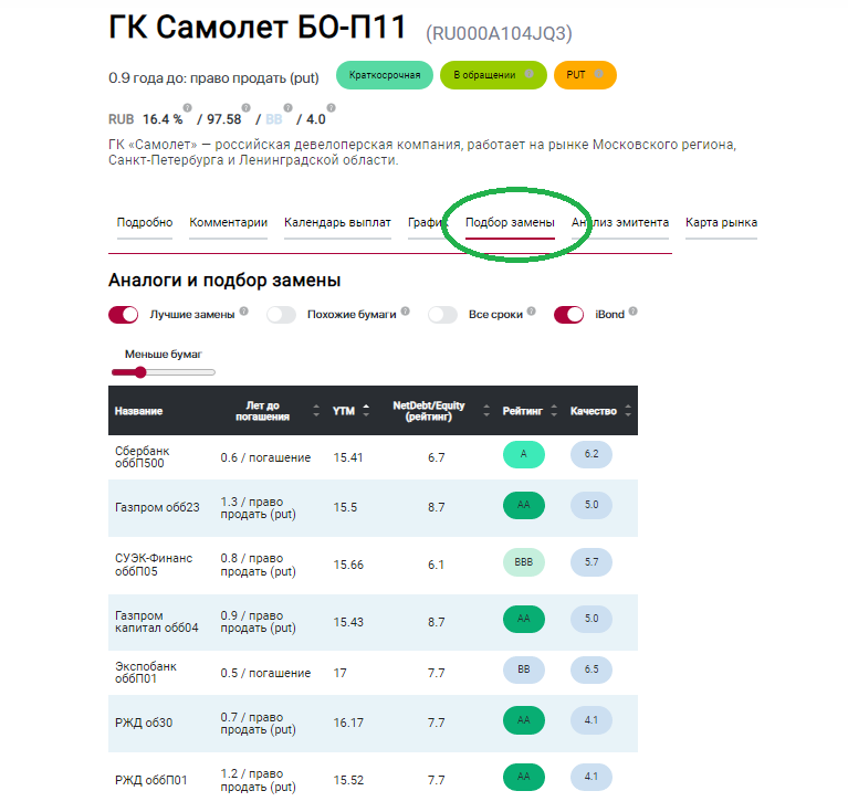 Функция «Подбор замены» на странице отдельной облигации в сервисе ДОХОДЪ «Анализ облигаций»