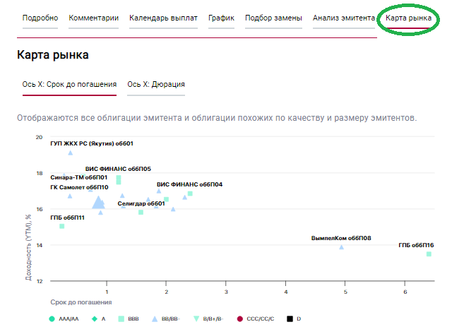 Для конкретной облигации на карте отображаются сразу только похожие на нее бумаги (режим «Все сроки»), а сама бумага выделяется большим значком.