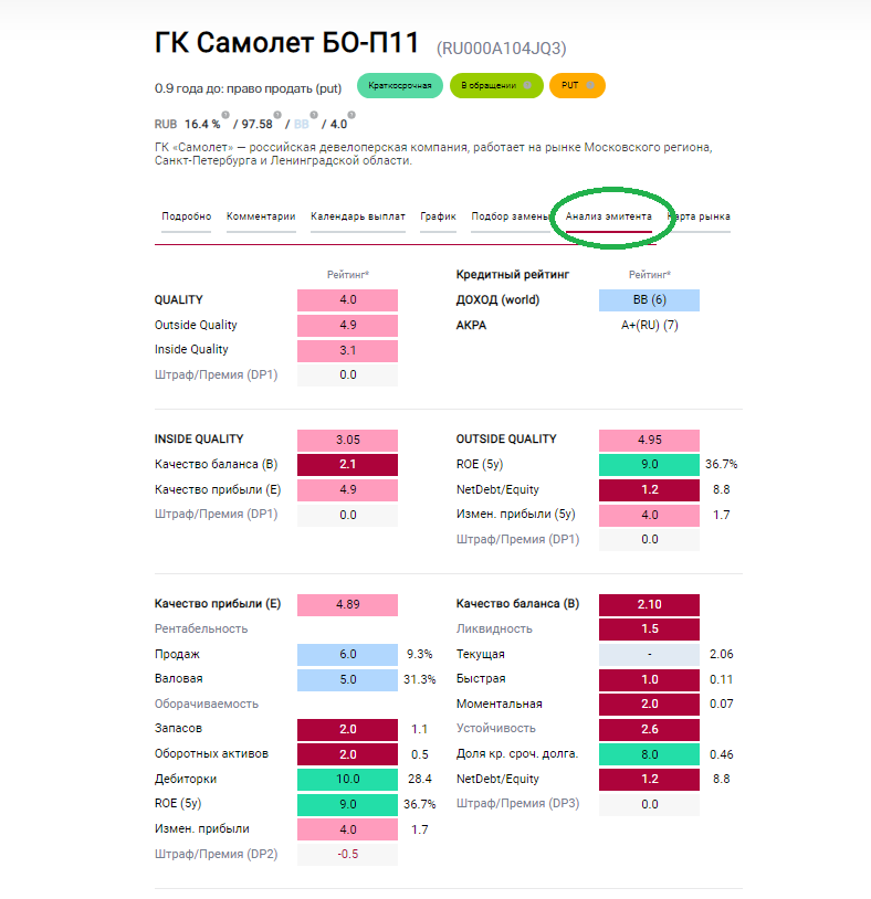 Здесь представлена комплексная оценка качества эмитента со всеми отдельными показателями, которые формируют ее.