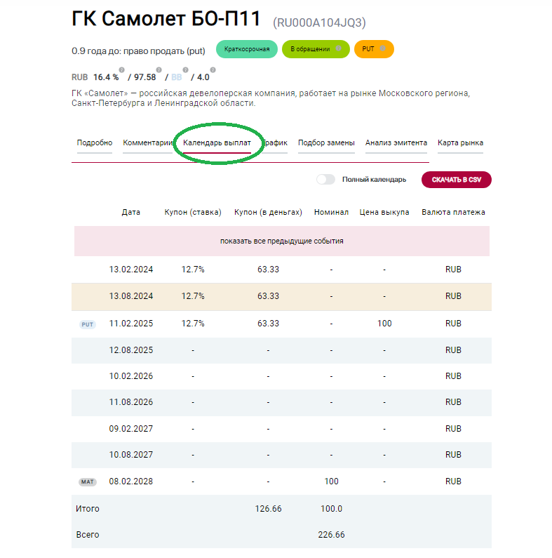 Появился календарь облигации, содержащий все даты и выплаты по ней (включая выплаты части номинала), а также индикаторы выкупов (опционы PUT и CALL) с ценой. Можно посмотреть только ближайшие выплаты, только предстоящие, только прошлые или весь календарь. Можно также скачать его в формате csv.