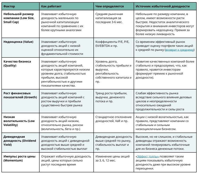 Таким образом, инвестирование, основанное на факторах, может предоставить возможность формировать портфели с большей ожидаемой доходностью и меньшим риском, чем у портфелей широких рынков, взвешенных по капитализации.