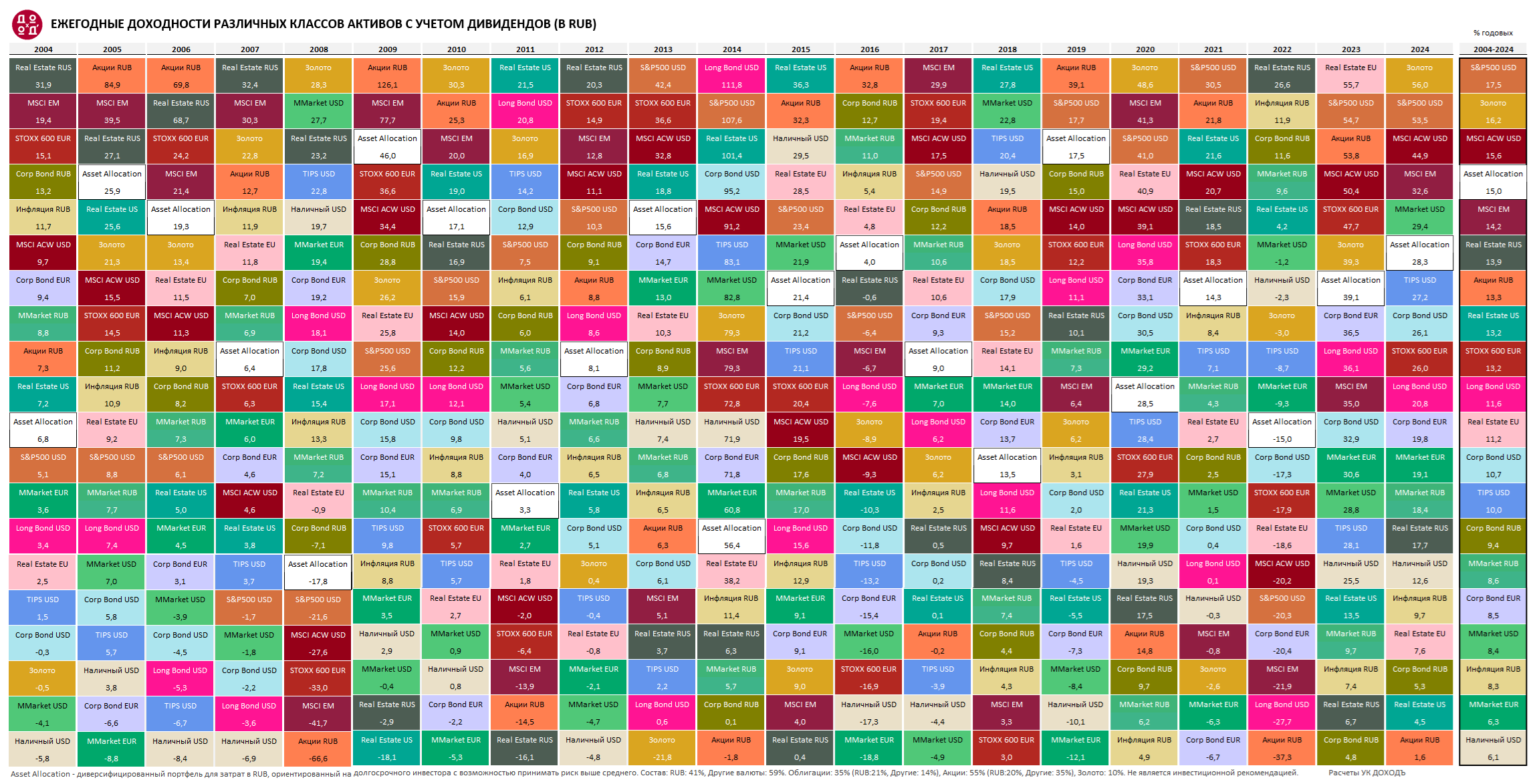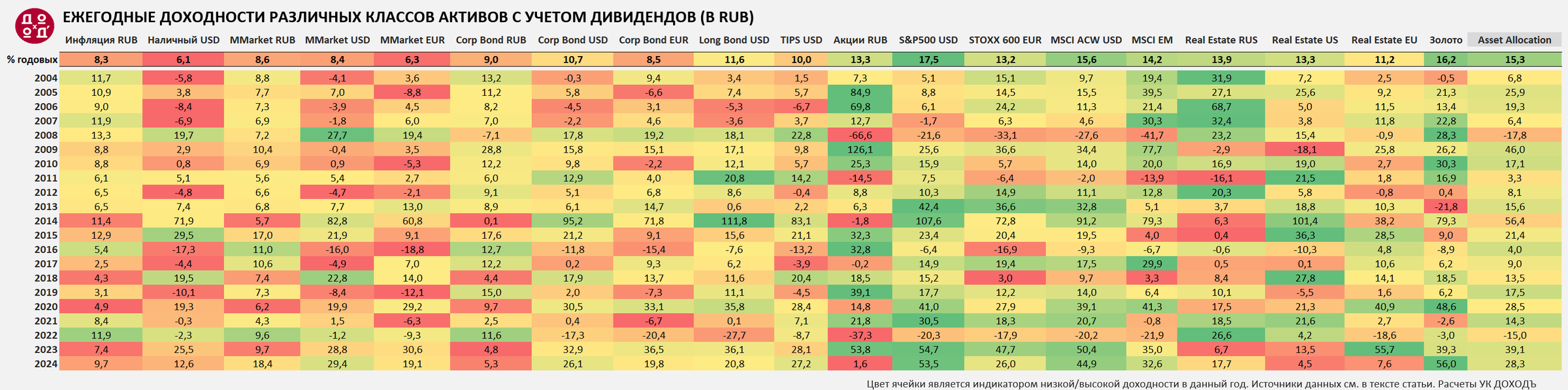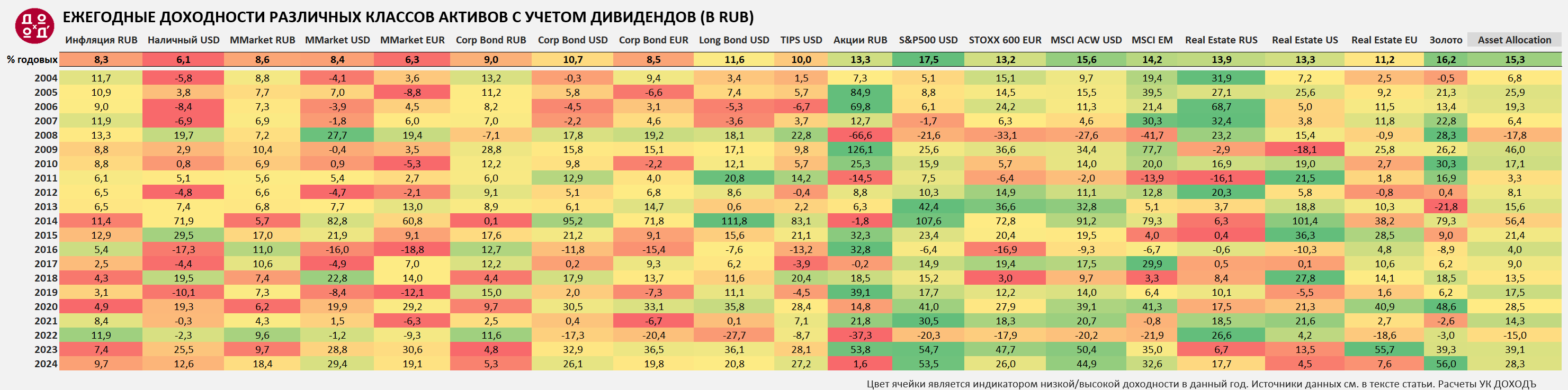 Мы подготовили инфографику, показывающую доходности (с учетом дивидендов и прочих поступлений) самых разных классов активов в привычных всем нам рублях: от денежного рынка до золота и жилой недвижимости в России, Европе и США за каждый год с 2004 по 2024.
