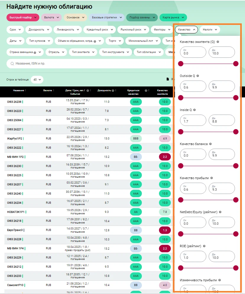 Если вы хотите самостоятельно использовать показатели качества эмитента в отборе облигаций, вы можете использовать фильтр "Качество" (доступен, если кликнуть "больше фильтров") как это показано на рисунке ниже.