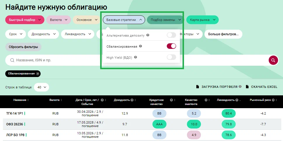 Таким образом, Базовые стратегии помогают вам комплексно применить сразу все важнейшие фильтры ко всем облигациям на рынке.