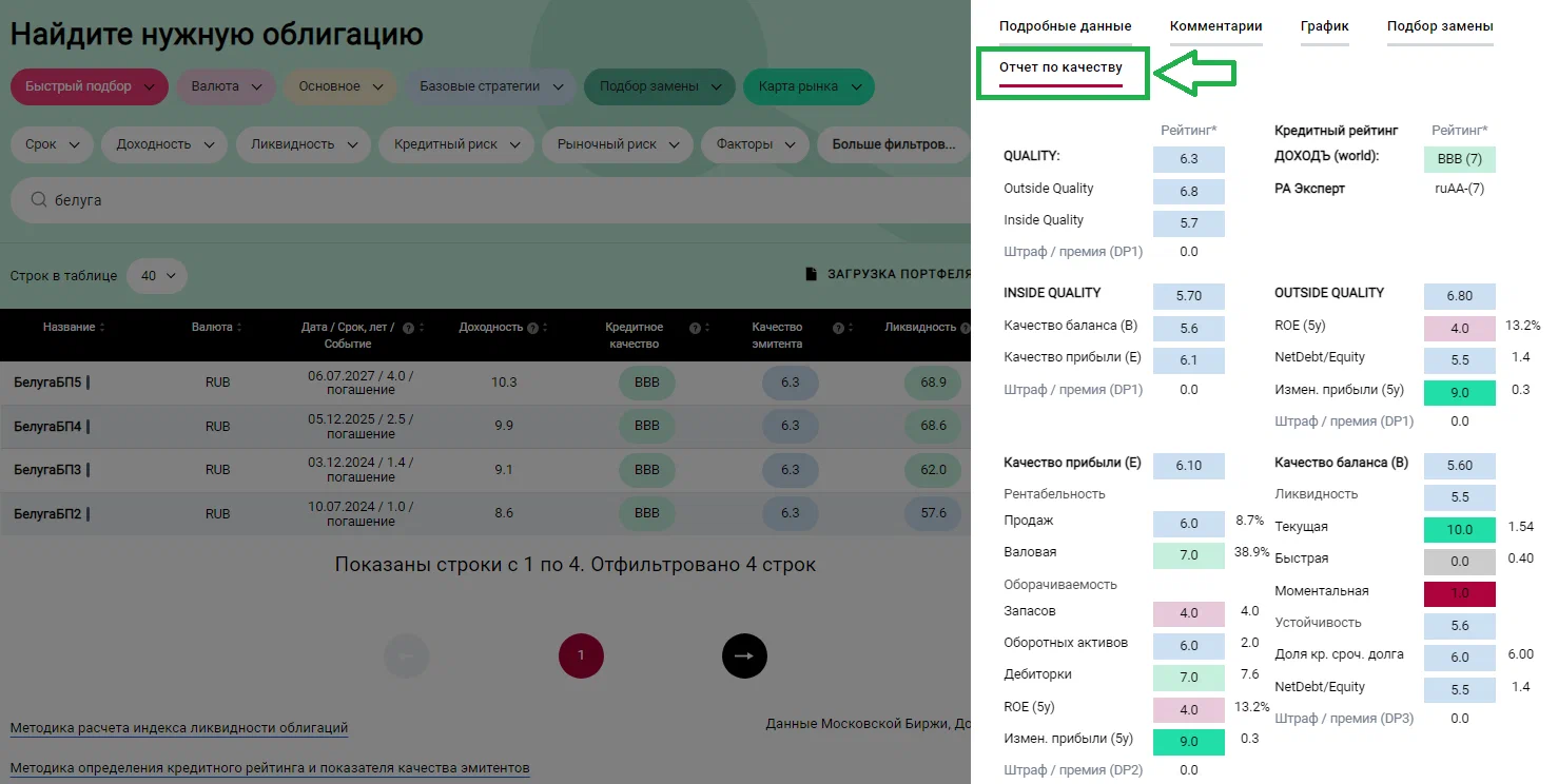 Для того, чтобы увидеть все составляющие показателя Качества эмитента, а также его кредитные рейтинги, щелкните по облигации, а далее выберете вкладку "Отчет по качеству".