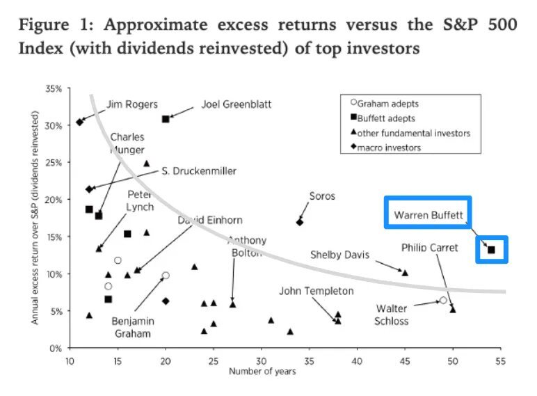 Даже Уоррен Баффет имеет среднегодовую доходность «всего» чуть более чем на 10% лучше рынка (на картинке ниже – результаты легендарных инвесторов в сравнении с рынком и длительностью их работы).