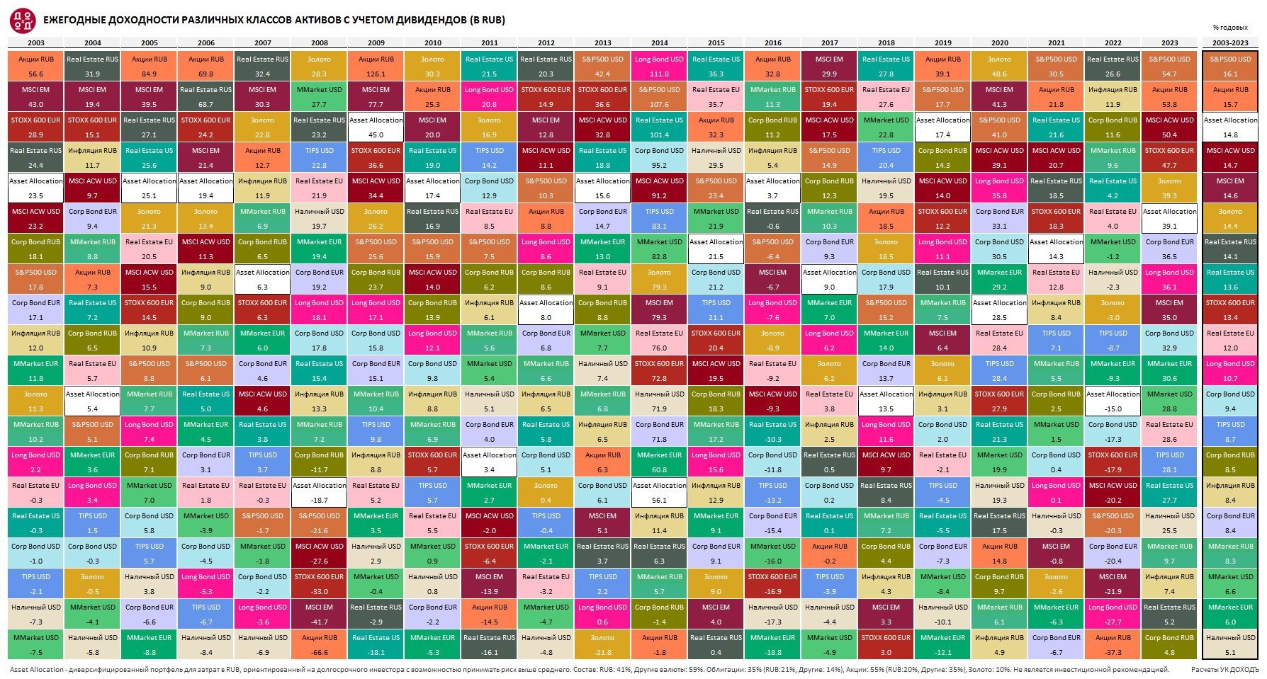 Доходности различных классов активов в рублях за каждый год в 2003-2023 гг. и за весь период в % годовых