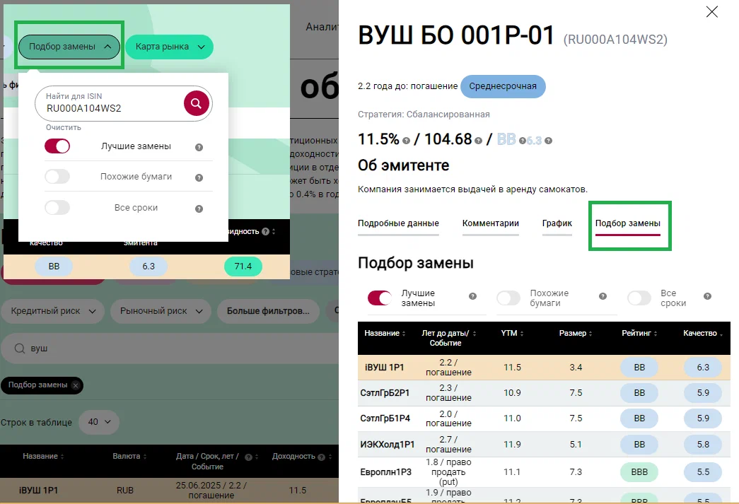 • Поиск лучших альтернатив для инвестиций - с помощью опции «Лучшие замены» можно увидеть похожие по качеству или более надежные бумаги с похожим сроком до погашения/оферты, такой же или более низкой сложностью и похожей или более высокой доходностью.