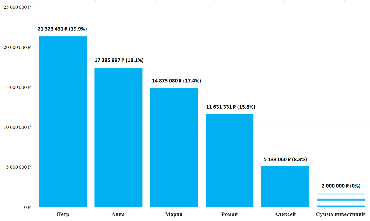 - Вторым же результатом может похвастаться Анна, накопившая за тот же период более 17 млн. руб. (18.1% годовых). Разница между первым и вторым местом составляет чуть больше 3.9 млн руб. Эта относительно небольшая разница особенно удивительна, если учесть, что Анна просто вкладывала свои деньги, как только получала их каждый год, без необходимости постоянного слежения за рынком.
