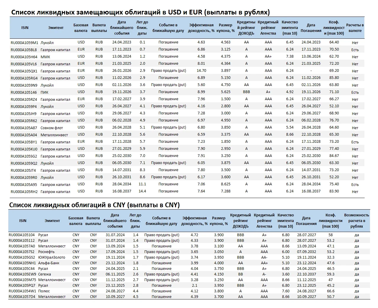 Список ликвидных замещающих облигаций в USD и EUR