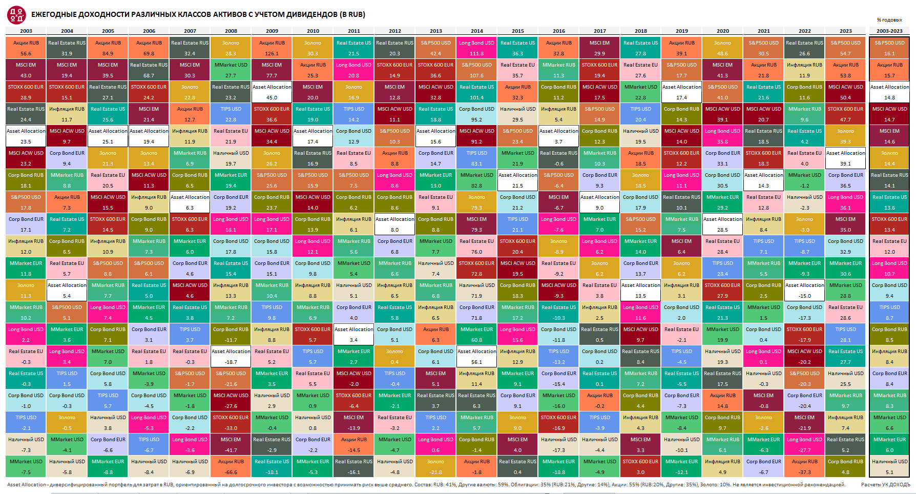 Ежегодные доходности различных классов активов с учетом дивидендов в RUB. Эта картинка в большом разрешении (png).