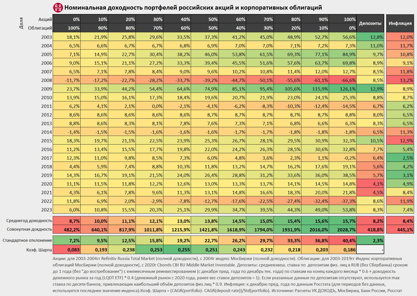 Доходности портфелей, состоящих из российских акций (включая дивиденды) и облигаций, а также доходность банковских депозитов и инфляция в 2003-2023 гг.