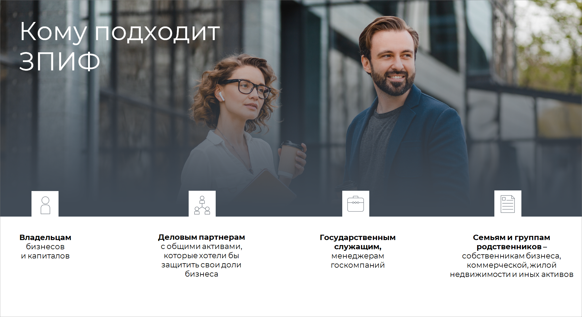 ЗПИФ подходит бизнесменам и компаниям, которые хотят объединить разрозненные активы для упрощения управления, оптимизации налогообложения и защиты семейного капитала