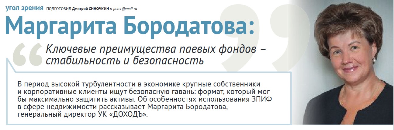 Маргарита Бородатова, генеральный директор УК "ДОХОДЪ", рассказывает о важных функциях ЗПИФ в текущей экономической ситуации в материале издания "Недвижимость и строительство Петербурга" :