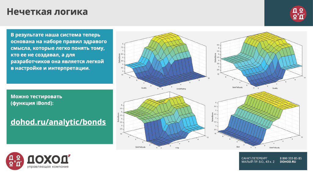 Затем специалисты УК «ДОХОДЪ» приняли решение использовать в сервисе «Облигации» нечеткую логику, основанную на правилах здравого смысла и лингвистических терминах. Нечеткая логика позволяет iBond более гибко учитывать такие факторы как «плохое», «среднее», «хорошее» в отношении качества эмитента или доходности облигации. Применение нечеткой логики для сопоставления всех переменных в оценке облигаций позволило получить более «натуральные» нелинейные зависимости различных факторов.